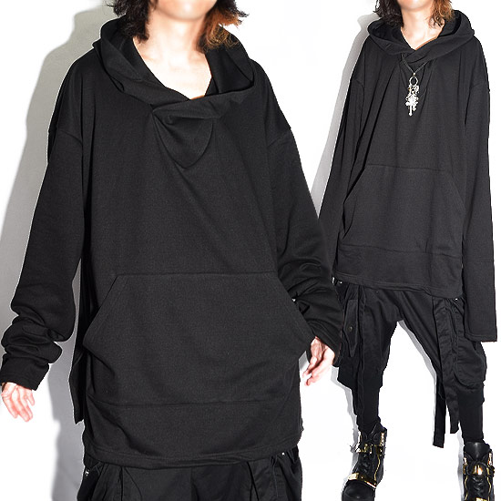 ロングtシャツ メンズ パーカー メンズ プルオーバーパーカー フードカットソー ロンt 変形 ビックシルエット 大きいサイズ 無地 ブラック 黒 お兄系 V系 ビジュアル系 ホスト 大人 2017 秋 冬 新作 30代 40代 個性的 モード系ファッション ストリート系ファッション 衣装